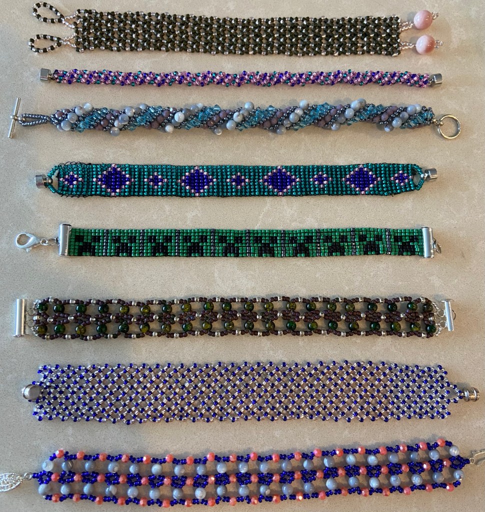 I started with a simple right-angle weave (RAW), which was a great starting-point for beginners like me, and later I jumped into bead looming. When I felt more comfortable, I watched tutorials about the different types of stitches, like the spiral rope stitch, brick stitch (pictured below), and square stitch.