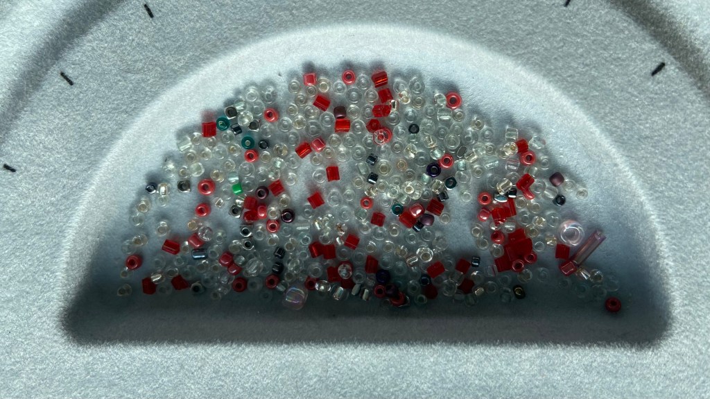 - Seed Beads: I started with 11/0, and threw some 8/0 into the mix. I have some unopened 15/0, but I’m nervous about working with such tiny beads.